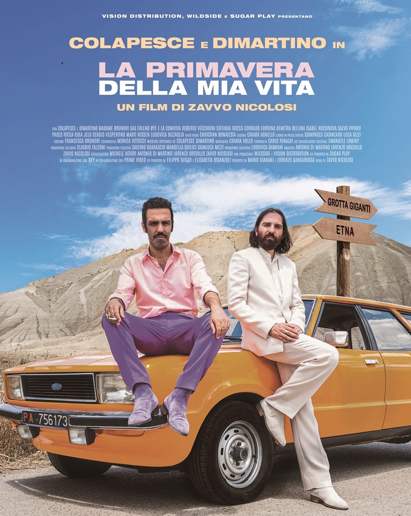 Chiudo con una bella notizia: da ieri è disponibile su Sky, NOWTV e Prime Video il film di Colapesce e Dimartino, La primavera della mia vita, di cui vi parlavo qualche mese fa. Non posso fare altro che consigliarvelo se avete una serata libera: con tutte le sue (belle) imperfezioni, è super godibile, e il significato è più profondo di quanto possiate aspettarvi.
