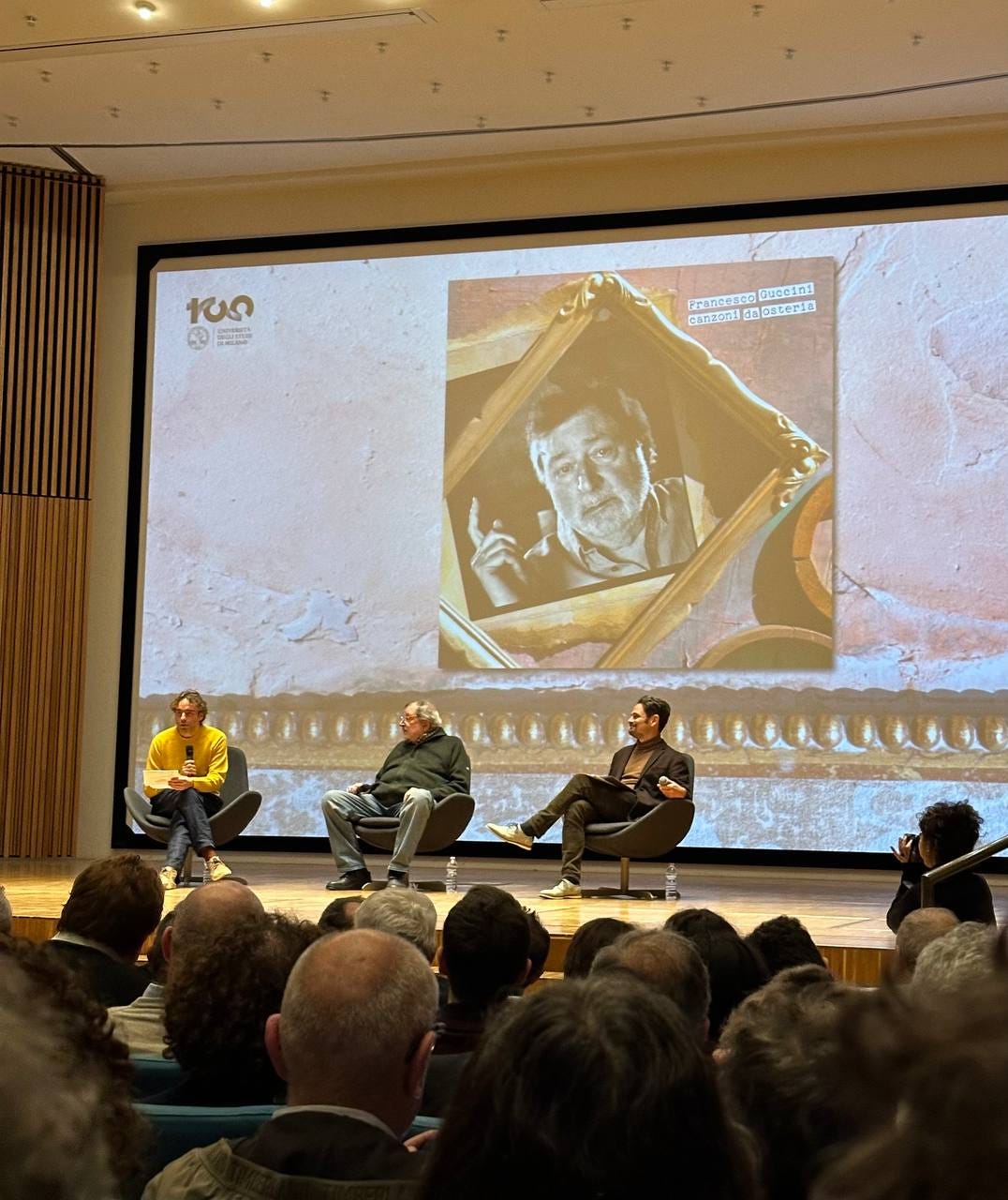 Venerdì scorso sono stato invitato alla Statale di Milano per la conferenza stampa di Francesco Guccini (uno dei miei padri musicali da sempre), che ha fatto uscire un nuovo album, Canzoni da osteria, SOLO IN FORMATO FISICO. Scelta bizzarra che sicuramente fa parlare di sè, ma di cui personalmente non condivido la filosofia. In ogni caso, l’album è una raccolta di 14 cover di canti popolari che Guccini cantava nel suo periodo universitario in giro per le osterie bolognesi. Un disco di puro divertimento, che può essere l’occasione per studiare un po’ di storia di musica con la voce narrante di uno dei più grandi cantautori del nostro paese :)